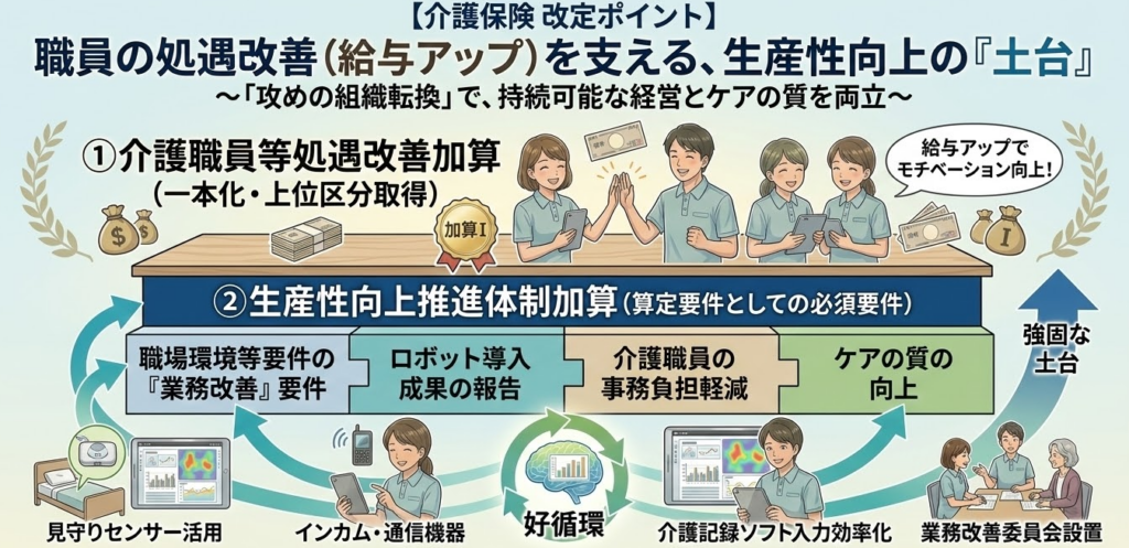 現在の制度設計では、職員の給与を上げるための「処遇改善加算」をより高い区分で取得し続けるために、「生産性向上推進体制加算」の取得が強力に紐付けられています。