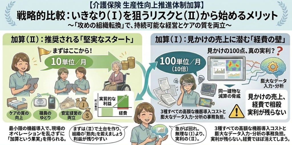令和6年度の介護報酬改定で新設された「生産性向上推進体制加算」。100単位という大きな数字(加算Ⅰ)に目を奪われがちですが、実務・経営の両面から見ると、まずは「加算Ⅱ(10点)」から着手することが、最もリスクが低く、実利の残る賢い選択です。